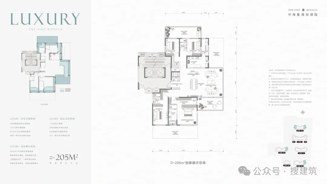 以建面约205㎡户型为例,全景舱多面采光带来超级居住享受,南北两侧设置浮岛式立体绿化阳台,与敞阔宽厅、主卧套房贯通,更大限度改善和满足采光通风和居住尺度需求。